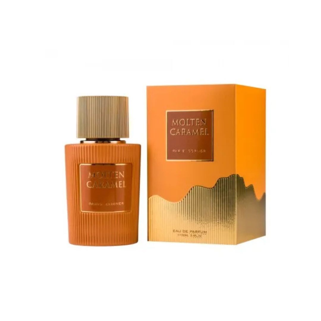 Molten Caramel by Paris Corner is a 100ml (3.4 oz) Eau de Parfum for men and women featuring a sweet, gourmand fragrance profile. Its scent profile includes a top note of creamy white chocolate, a heart of milky caramel, and a base of brown sugar, vanilla, and praline. The fragrance is known for its long-lasting, warm, and indulgent aroma, creating a sweet and comforting scent experience